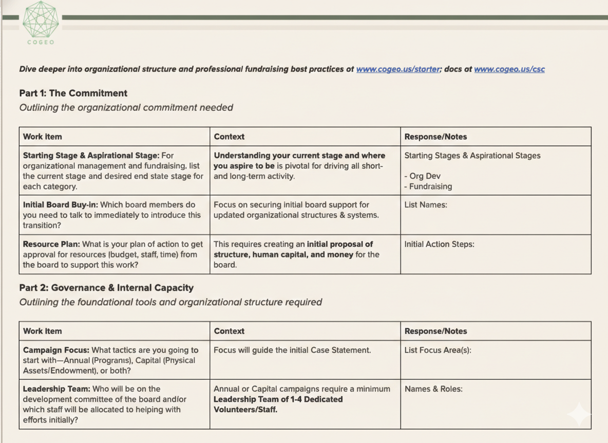 The COGEO Starter Program is a comprehensive guide designed to support organizations with building organizational capacity, securing funding, and driving sustainable growth. The Program draws from COGEO’s extensive experience working with tax-exempt organizations across the country.