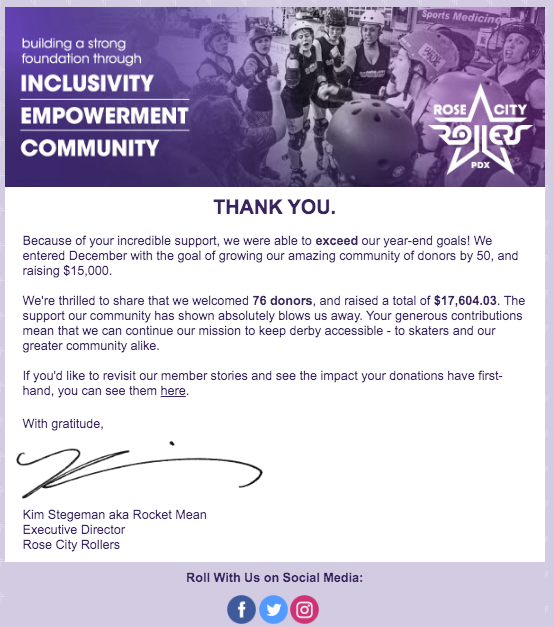 “At Rose City Rollers, we had barely asked for donations, let alone donations of such a large size. Cogeo’s coaching made me feel much more comfortable in my approach -- and it paid off,” says Kim, RCR’s Executive Director.